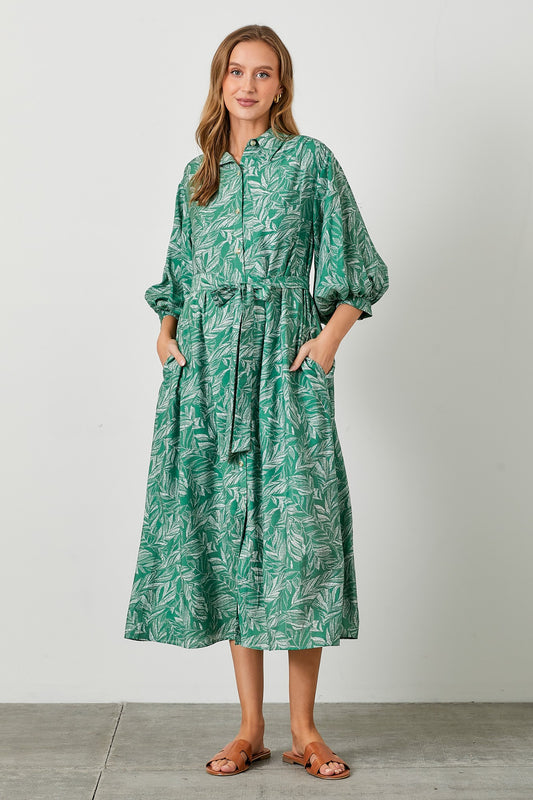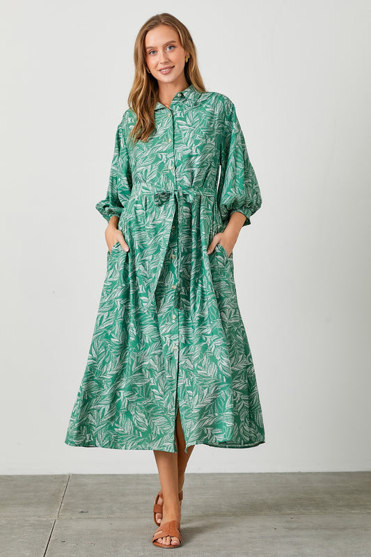 Phoebe Button Front Long Sleeve Midi Dress-Hunter Green -