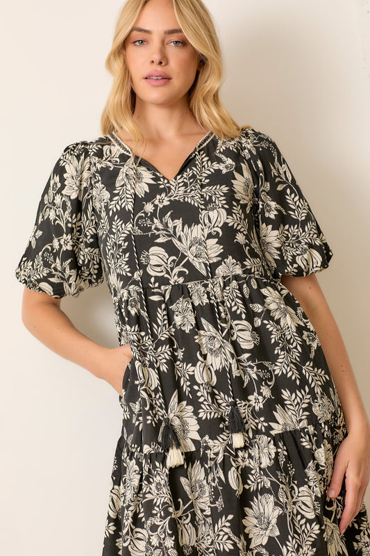 Sienna Floral Design Tiered Midi Dress-Rust Cordouroy